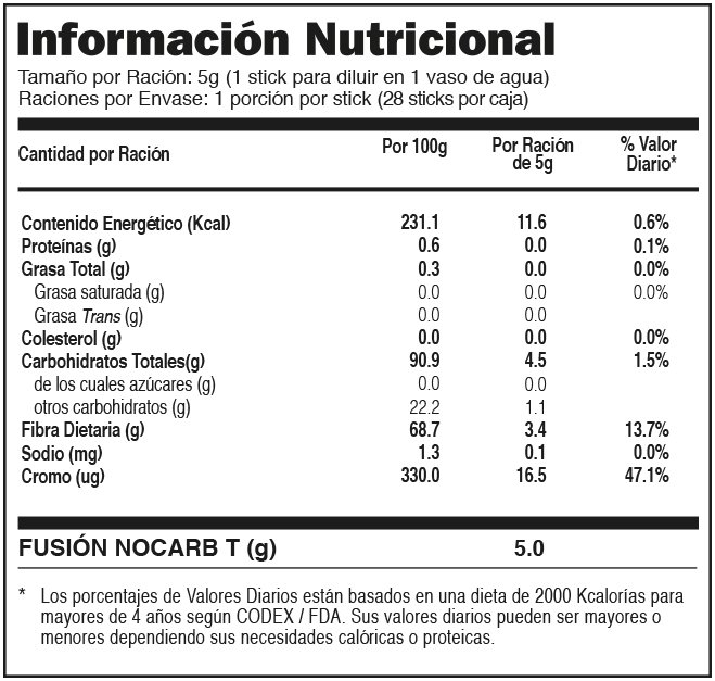 Fusión Nutracéutica: Fibras solubles (extracto de yacón, fibra de acacia, inulina de achicoria, pectina de manzana) + Extracto de Canela + Extracto de Té Verde + Cromo en molécula orgánica.